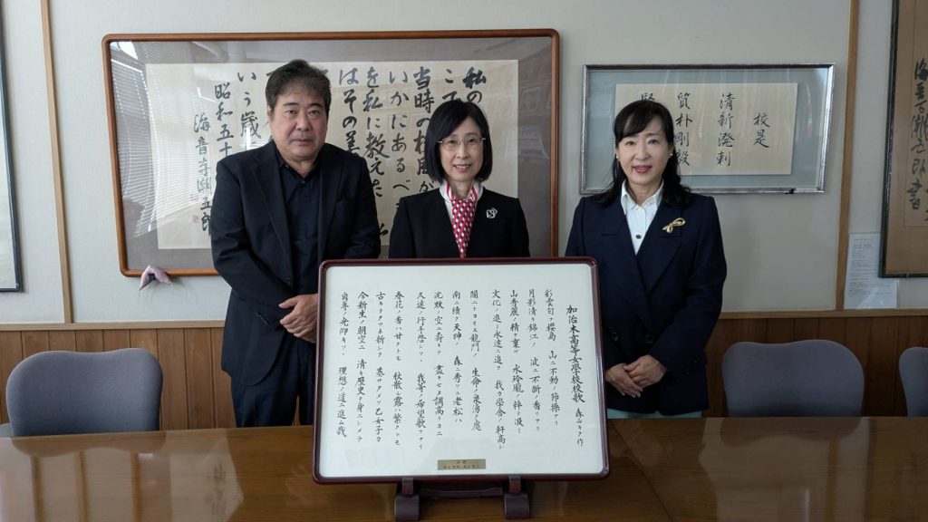 渡邊様が東京の筆耕屋へ依頼され、当時の書体で書かれたそうです。加高女の校歌にふさわしい